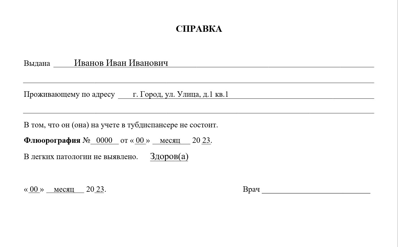 Справка флюорографии содержит результаты рентгенологического исследования легких, которые показывают состояние органов грудной клетки, отсутствие патологических изменений и признаков туберкулеза.